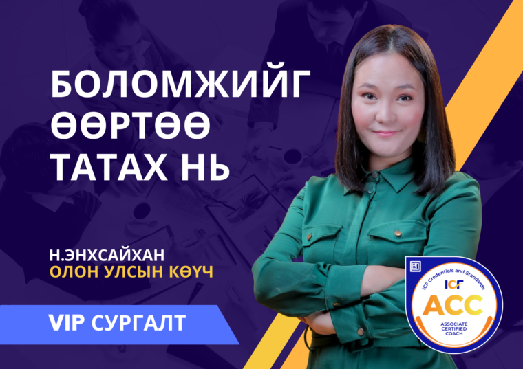 Coaching Зорилгодоо хүрэхийн тулд өөртөө цаг хугацааг харамгүй зарцуулж чадах хүн бүрт зориулсан 3 сарын багц үйлчилгээ. 30 минутын үнэ төлбөргүй танилцах уулзалт Зорилго тодорхойлох Нэг удаадаа 60 минутын хугацаатай 3 удаагийн көүчинг уулзалт 3 сарын хугацаатай үр дүнд суурилсан имэйл харилцаа Үнэ: 1.500.000₮ Захиалга үүсгэхCoaching Богино хугацаанд өөрийгөө дайчлан зорилгодоо хүрэхийг хүссэн хүн бүрт…